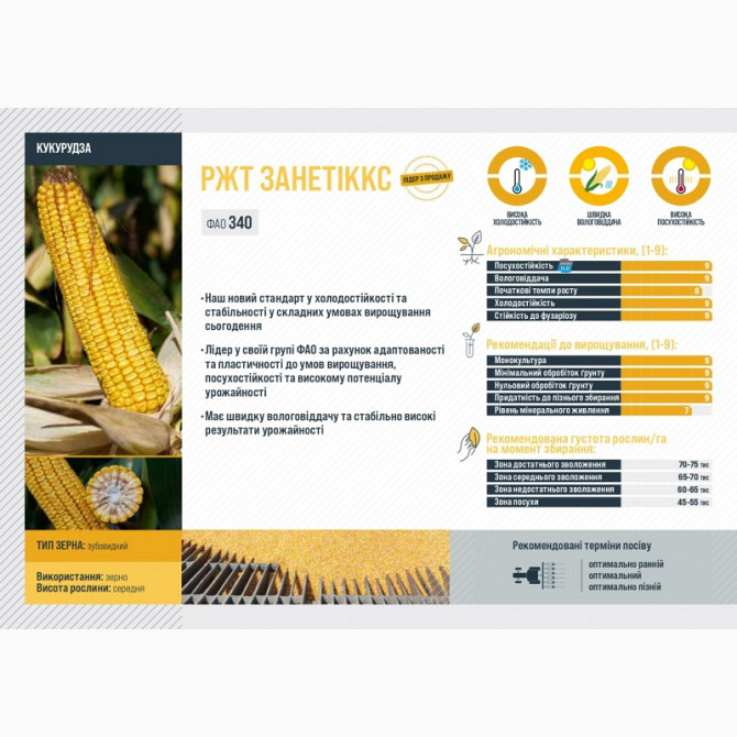 Кукурудза РЖТ ЗАНЕТІКК: Технічний Опис Тип використання: Зерно Група стиглості: Середньостигла FAO: 340 Кукурудза РЖТ ЗАНЕТІКК є новим стандартом у холодостійкості та стабільності в складних умовах вирощування. Вона відзначається високою адаптованістю та пластичністю до різних умов вирощування, вк...