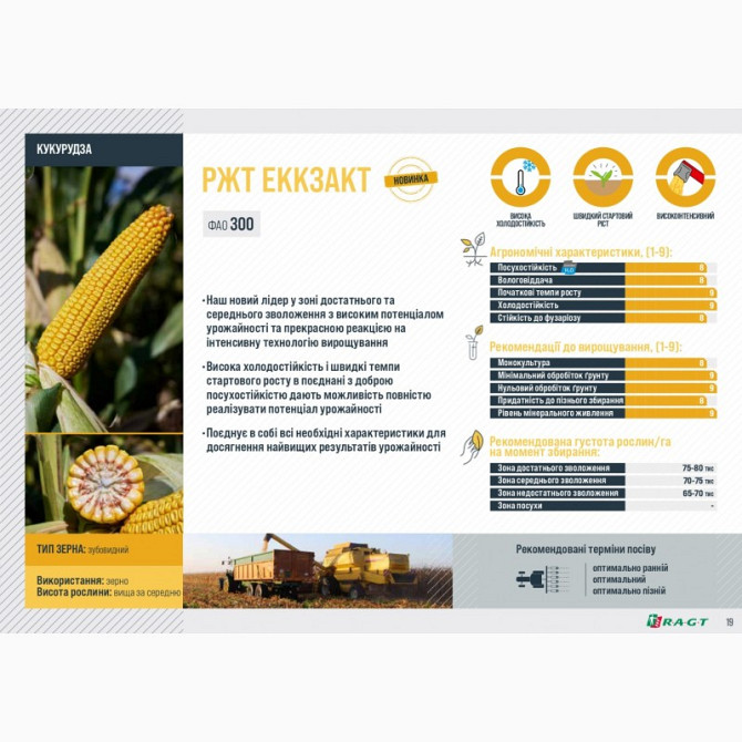 Кукурудза РЖТ ЕККЗАКТ є сортом середньостиглого зерна, призначеним для вирощування в умовах достатнього та середнього зволоження. За класифікацією FAO, відноситься до групи 300. Цей сорт відзначається високим потенціалом урожайності та доброю реакцією на інтенсивну технологію вирощування. Характери...