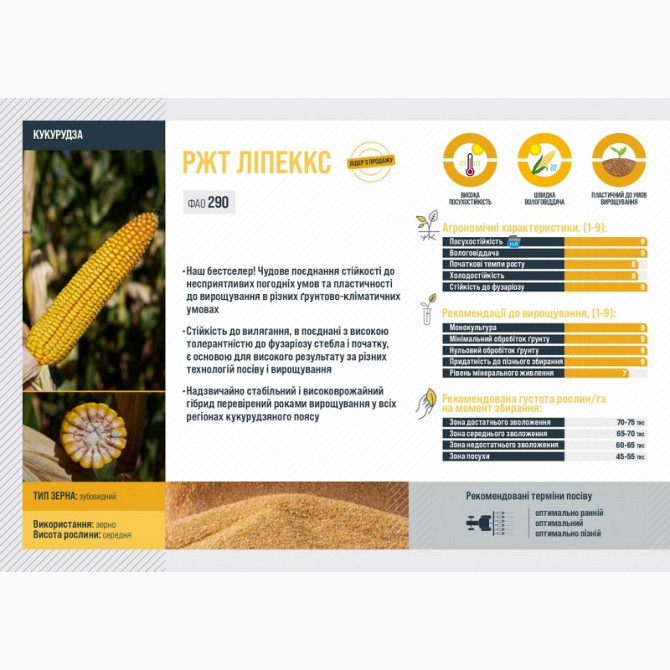 Кукурудза РЖТ ЛІПЕККС Технічний опис: - Тип використання: Зерно - Група стиглості: Середньорання - Шифр FAO: 290 - Тип зерна: Зубовидний - Використання: Зерно - Висота рослини: Середня Опис продукту: Кукурудза РЖТ ЛІПЕККС є бестселером у своїй категорії завдяки відмінному поєднанню стійкості до не...