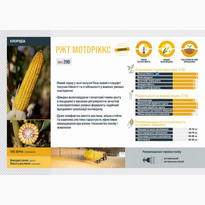 **Гібрид кукурудзи РЖТ МОТОРІККС** *Технічний опис:* - **Тип використання:** Зерно - **Група стиглості:** Середньорання - **FAO:** 290 Кукурудза РЖТ МОТОРІККС є новим лідером у зоні посухи. Цей гібрид відзначається високою посухостійкістю та стабільністю у важких умовах сучасності. Швидка вологові...