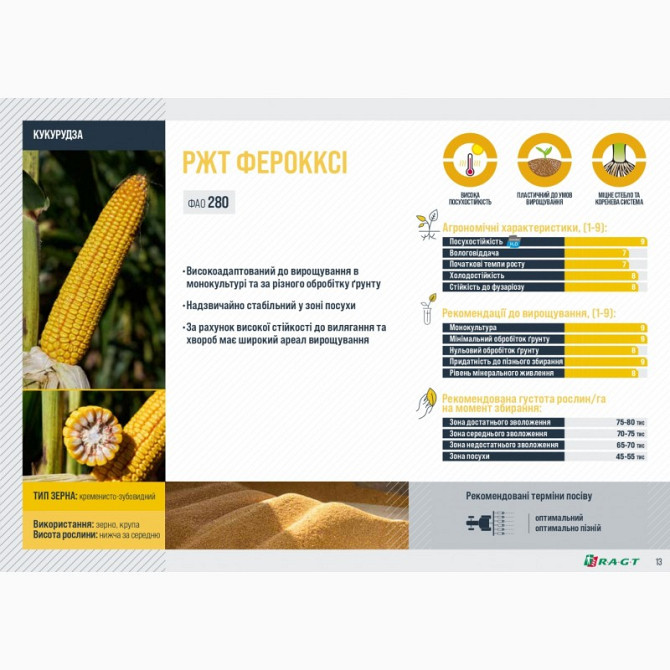 Кукурудза РЖТ ФЕРОККСІ є сортом середньоранньої стиглості з високою адаптивністю до різних умов вирощування. Цей гібрид відзначається надзвичайною стійкістю до посухи і вилягання, а також широким ареалом вирощування завдяки високій стійкості до хвороб. Технічні характеристики: - Тип зерна: кременис...