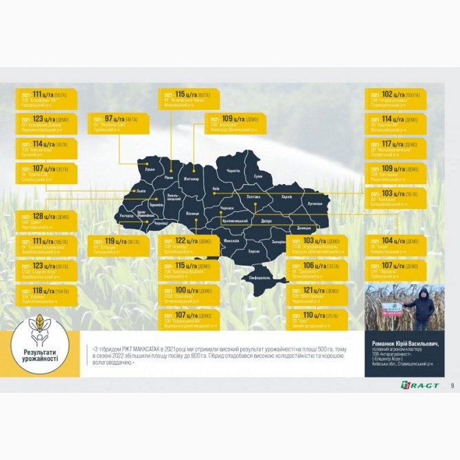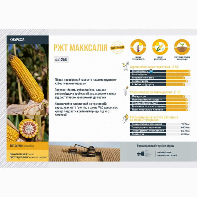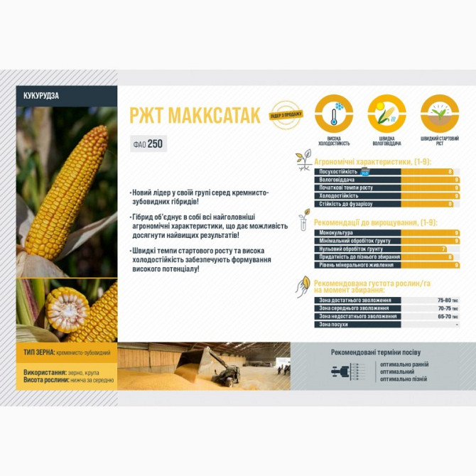 Кукурудза - Гібрид РЖТ МАККСАТА --- **Технічний опис:** - **Тип використання:** Зерно - **Група стиглості:** Середньорання - **FAO:** 250 **Опис:** Гібрид РЖТ МАККСАТА є новим лідером серед кремнисто-зубовидних гібридів. Цей гібрид поєднує всі ключові агрономічні характеристики, що дозволяють дося...