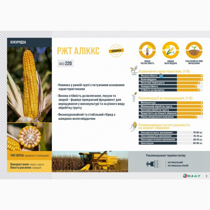 Кукурудза РЖТ АЛІККС є ранньостиглим гібридом з високою стійкістю до вилягання, посухи та хвороб. Цей гібрид відзначається потужними основними характеристиками, що роблять його ідеальним вибором для вирощування як у монокультурі, так і при різних методах обробітку ґрунту. Технічні характеристики Ку...