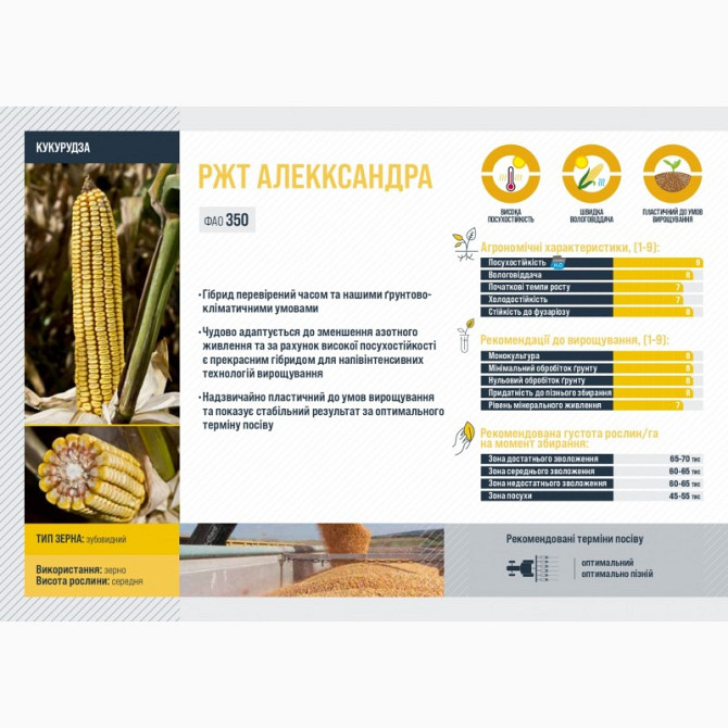 **Опис гібриду кукурудзи RZHT АЛЛЕКСАНДРА** Кукурудза RZHT АЛЛЕКСАНДРА є середньостиглим гібридом, що відноситься до групи зернових культур. Він має позначення FAO 350 і відзначається високою стійкістю до посухи, що робить його ідеальним для вирощування в умовах недостатньої вологості. Цей гібрид у...