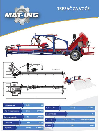 Пропонуємо Вам Фруктозбиральну машину. Цей продукт є вельми ефективним для збору слив, вишень та інших фруктів. Машина використовує встряхуючий зажим для вібрації фруктових дерев, що спричиняє випадання плодів. Фрукти падають на полотно, яке після падіння всіх плодів звивається, транспортуючи їх на ...