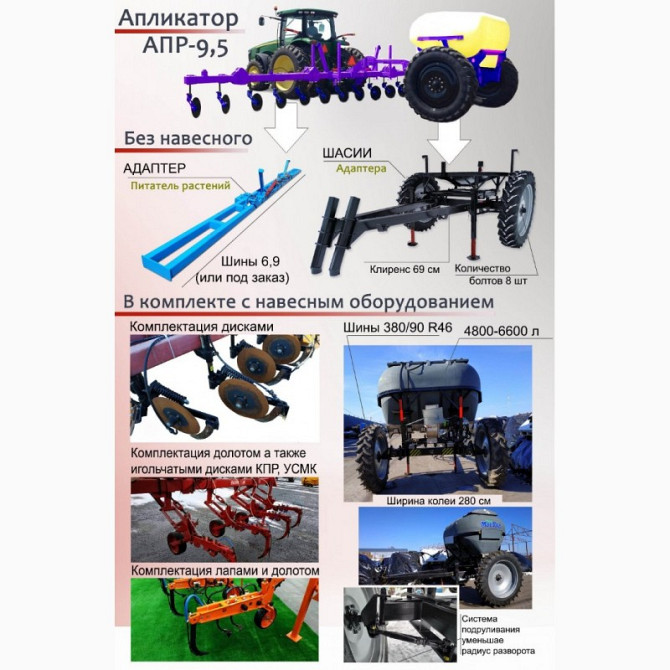 Шасі з об'ємом можна комплектувати системою подачі рідких добрив СЗР для внесення їх на глибину до 25 см для легкого попередньосівного та міжрядкового внесення NH3 або рідких добрив. Шасі АПР-9.5 з баком (ємністю) об'ємом від 4800 до 6600 л, обладнане шинами 380/90 R46, шириною колії 280 см, з кліре...