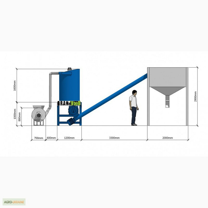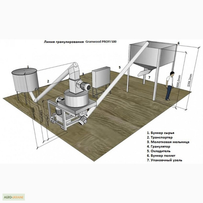 Лінія гранулювання забезпечує продуктивність до 500 кг/год (для комбікорму – до 1250 кг/год). Основні компоненти лінії включають у себе молоткову млин 11-15 кВт, транспортні канали з бункером для сировини, гранулятор потужністю 30 кВт, охолоджувальний шафт та систему управління. Молоткова млин розм...