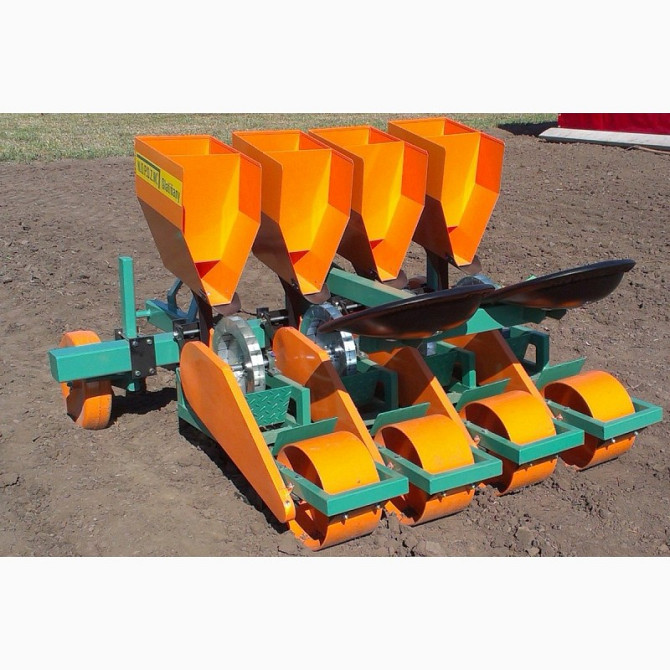 Чесночна сіялка для трактора є приціпною 4-рядною машини для посадки чесноку (лука, тюльпанів) з міжряддям від 20 до 40 см. За один крок можна висівати 11 штук на метр. Глибина посадки може коливатися від 40 мм до 150 мм. Продуктивність машини становить від 1,5 до 3 гектарів на день. Сіялка обладнан...