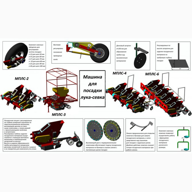 Сажалка для чеснока МПЛС призначена для пунктирної (точкової) посадки лука-сівка, чесноку та інших луковичних культур (тюльпанів, нарцисів, крокусів) двохрядковим методом. Відстань між рядами становить 40 см або 70 см, а відстань між точками посадки — 12 см. Пропозиції включають в себе різні варіант...