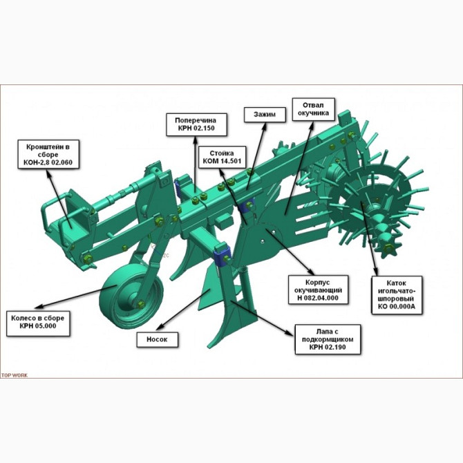 Призначений для різання гребінів, міжрядного обробітку після висіву та післясходової обробки чотирьохрядних посадок картоплі з одночасним боронуванням та окучуванням, боронуванням на висходах, окучуванням або культивацією, підживленням рослин сипучими мінеральними добривами. За замовленням покупця к...