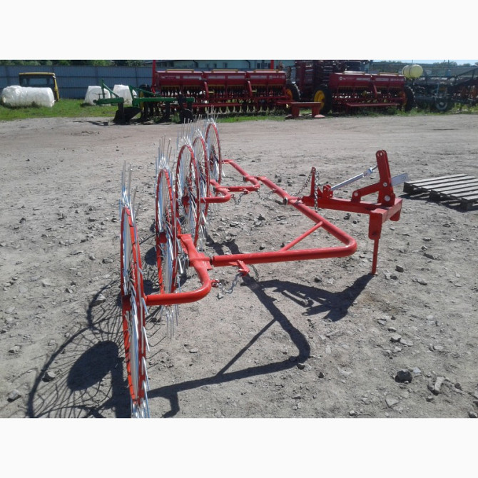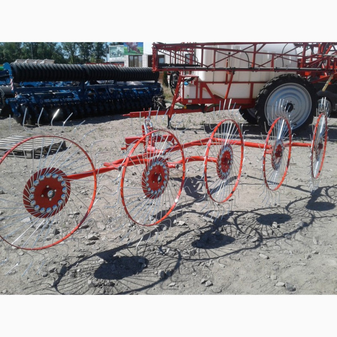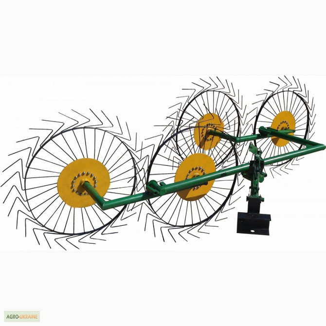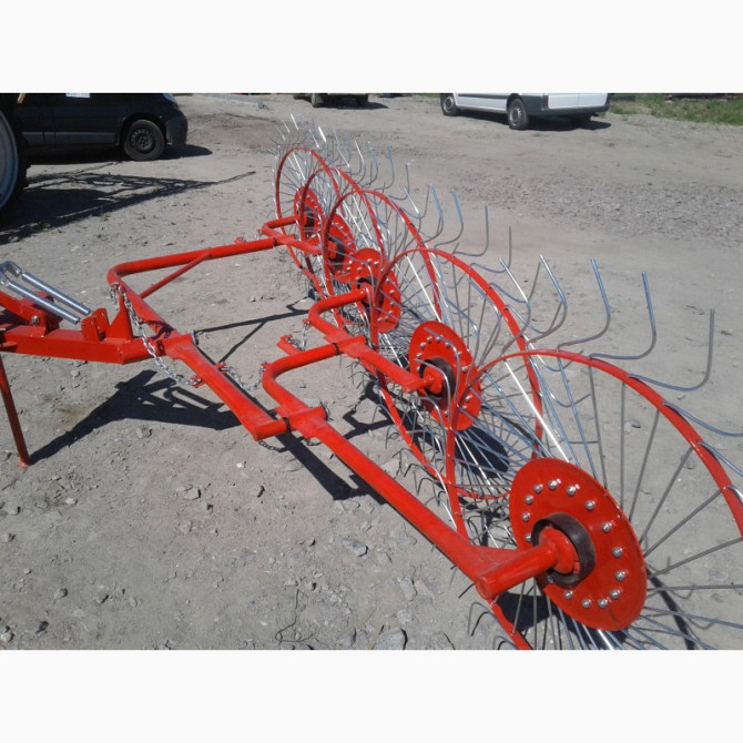 Граблі-ворушилки (валькові) на п'ять коліс призначені для сгребання провіялої і свіжокошеної трави. Цей сільськогосподарський інструмент використовується для формування сіна або соломи в рівні снопи для подальшого збору або сушіння. Технічні характеристики: - Кількість коліс: 5 - Матеріал виготовле...