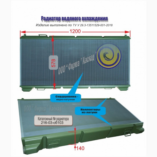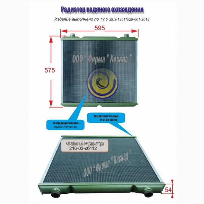 Радіатор водяний 216-03-сб103 Каталожний номер: 216-03-сб103 Радіатор водяного охолодження, виготовлений компанією "Фірма «Каскад»", є аналогом радіатора, широко використовуваного в спецтехніці. В радіаторі застосовано колектори з латуні та міднолатунної серцевини. Технічні параметри розроблені зг...