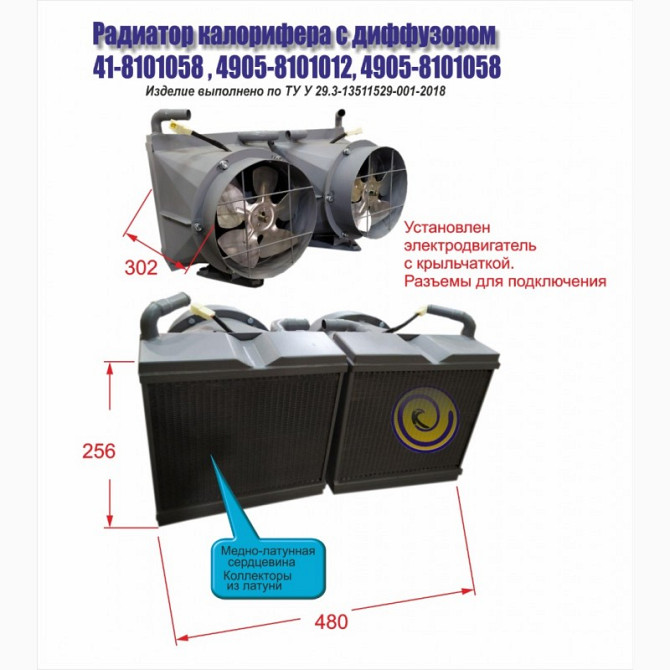 Радіатор калорифера з дифузором Каталожні номери: 41-8101058, 4905-8101012, 4905-8101058 Радіатор водяного охолодження, виготовлений ООО фірмою "Каскад", є аналогом радіатора, широко застосовуваного на спецтехніці. На радіаторі встановлений електродвигун з крилом. Роз'єми для підключення. У радіат...