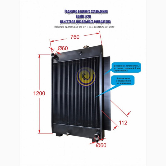 Радіатор водяного охолодження двигуна дизель-генератора SDMO J220 Радіатор водяного охолодження, виготовлений ООО фірмою «Каскад», є аналогом радіатора, що широко використовується на спецтехніці. Виробництво використовує алюмінієві матеріали для серцевини та колекторів. Технічні параметри розроблен...