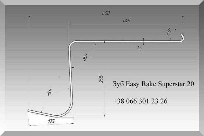 **Технічний опис продукту: Зуб Easy Rake Superstar 20** Зуб Easy Rake Superstar 20 - це пружинний зуб для прицепних V-образних граблів, призначений для використання в сільському господарстві та сільському господарстві. Цей зуб доступний у різних розмірах: 16, 18, 20 та 22 дюйми. Технічні характери...
