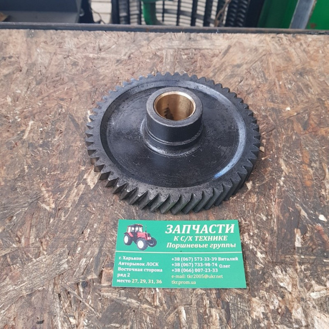Шестерня проміжна Д37М-1006240А8 насаджена на палець запресований у картер двигуна, і перебувати у постійному зачепленні з шестернею розподільчого валу та шестернею приводу паливного насоса. Шестерня має 50 зубів. Модуль 2,5. Кут зачеплення? 20 градусів. Для плавнішого зачеплення шестерня Д37М-10062...