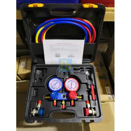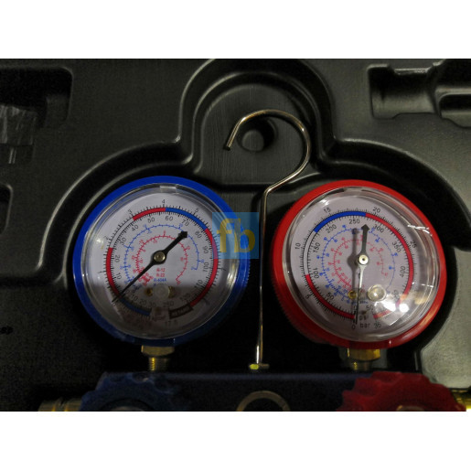 Манометричний колектор для холодоагенту R134a застосовується для вимірювання високого та низького тиску в холодильних системах, оснащений корпусом з двома регулюючими клапанами, оглядовим склом та трьомакольоровими шлангамидовжиною 150 см, автомобільними швидкознімними клапанами (муфтами). коробка-в...