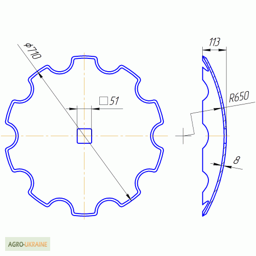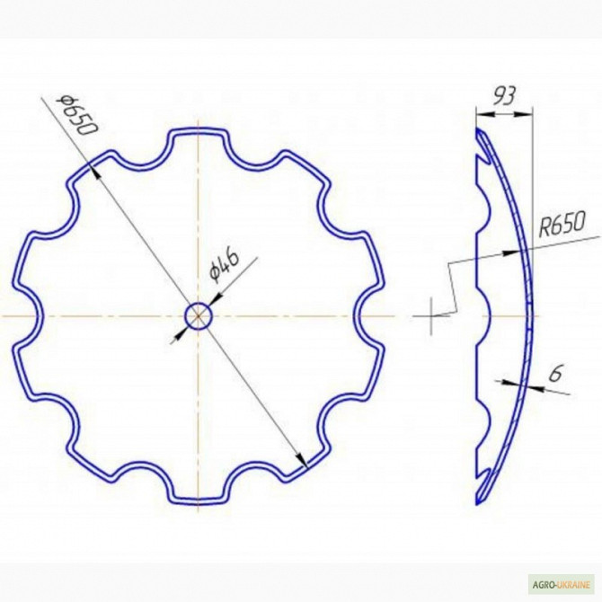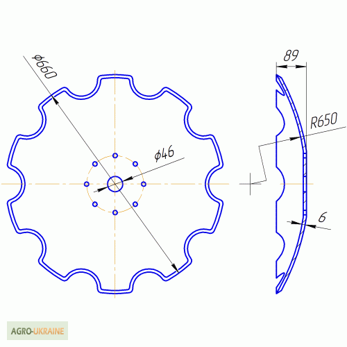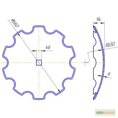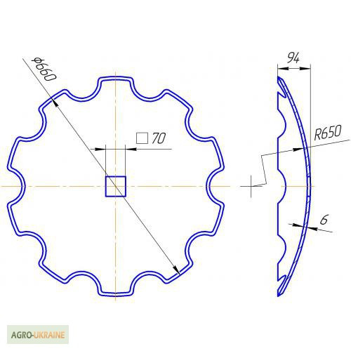 Вища якість України! - Диск борони вирізний (старого зразка), зовнішній діаметр 660 мм, внутрішній квадрат 46х46 мм, 10 зубів, товщина 6 мм, вага 15 кг, - Диск борони сферичний (старого зразка), зовнішній діаметр 660 мм, внутрішній квадрат 46 мм, гладка кромка, товщина 6 мм, вага 16 кг. ), зовнішній...