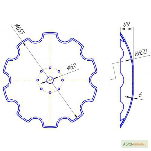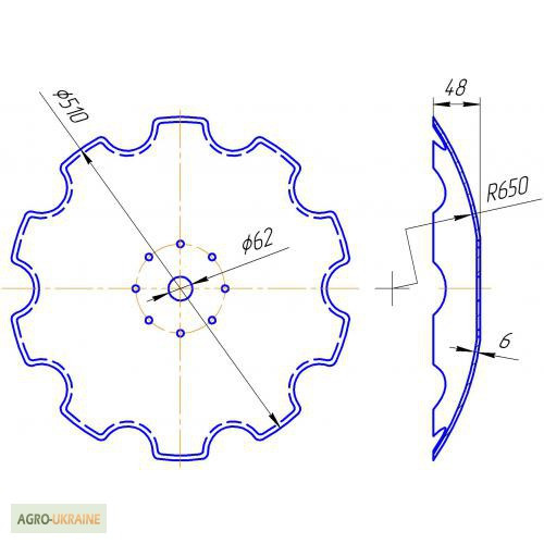 Вища якість України! 1) Диск борони, вирізний, зовнішній діаметр 655 мм, внутрішній отвір діаметром 62 мм, 8 отворів діаметром 11 мм під маточину, 10 зубів, товщина 6 мм, вага 15 кг, 2) Диск борони, вирізний, зовнішній діаметр 510 мм, внутрішній отвір діаметром 62 мм, 8 отворів діаметром 11 мм під м...
