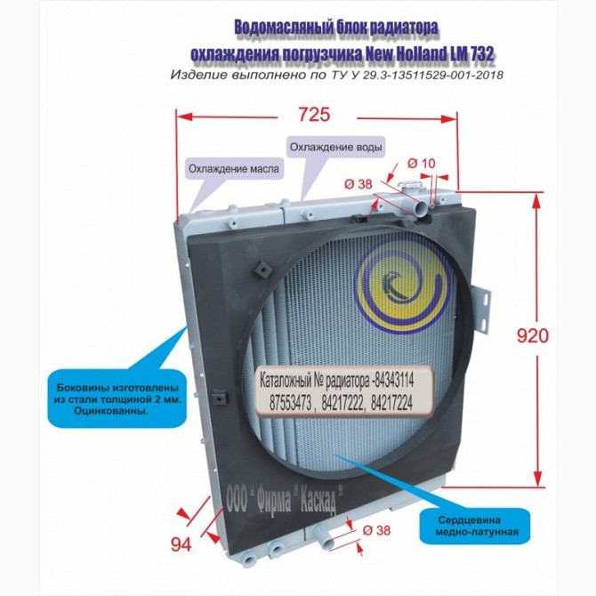 **Технічний опис водомасляного блоку радіатора охолодження телескопічного навантажувача New Holland LM 732** Водомасляний блок радіатора охолодження телескопічного погрузчика New Holland LM 732, виготовлений ООО фірмою «Каскад», є аналогом радіатора з каталожними номерами 84343114, 87553473, 842172...