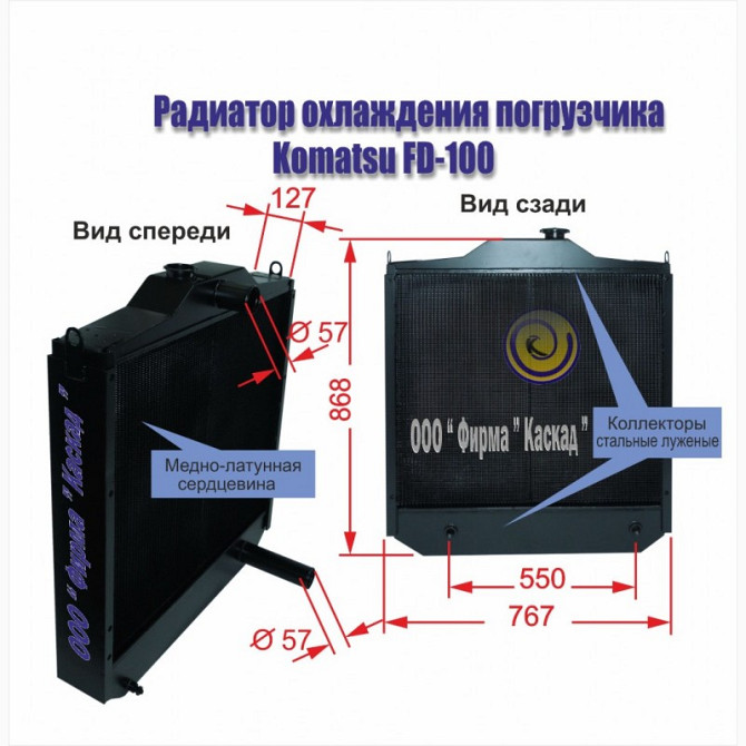 Радіатор охолодження погрузчика Komatsu FD 100, виготовлений ООО фірмою «Каскад», є аналогом радіатора, широко використовуваного на спецтехніці. Каталожний номер: 3FE-04-41110. Наш виріб має мідно-латунне серцевину та сталеві лужені колектори. Технічні параметри розроблені згідно з ТУ У 29.3-1351152...