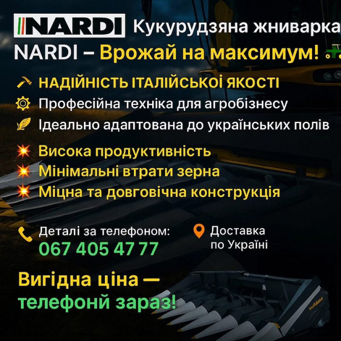 Пропонуємо професійну італійську техніку для агробізнесу — кукурудзяну жниварку NARDI, яка поєднує високу ефективність, міцність конструкції та адаптованість до українських умов. Переваги: - Надійність італійського виробництва. - Висока продуктивність з мінімальними втратами зерна. - Довговічна ...