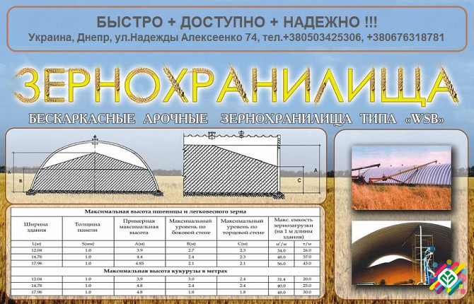 Арочні зерносховища є надійними спорудами для зберігання зернових культур. Вони виготовлені з високоякісної оцинкованої сталі і пропонуються "під ключ" нашим підприємством. Зерносховища виготовляються на обладнанні фірми WSB з США в місті Дніпро, Україна. Кожне зерносховище має різну зернову ємніст...