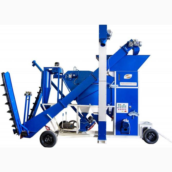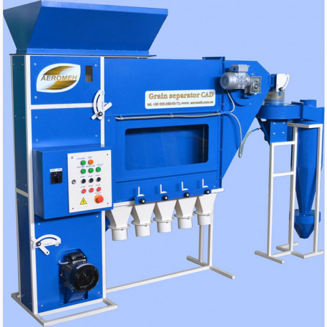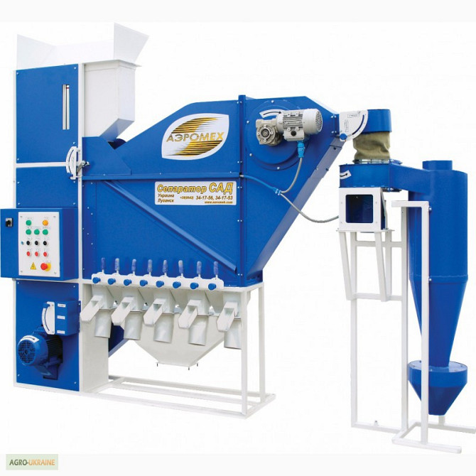 Високоефективний та багатофункціональний зерновий сепаратор САД-5 з циклоном є невід'ємним помічником в господарствах з посівними площами до 300 га. **Технічні характеристики:** - Продуктивність: - на попередній очистці – до 8 т/год - на першій очистці – до 5 т/год - на калібруванні (сортув...