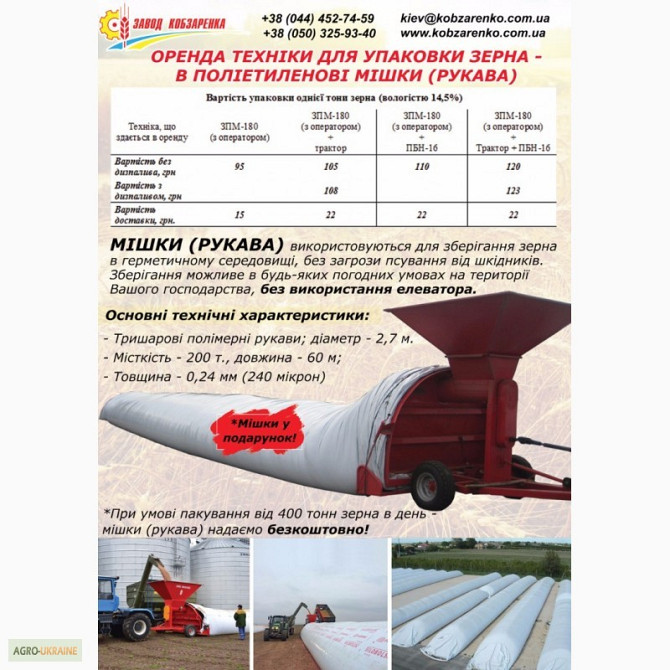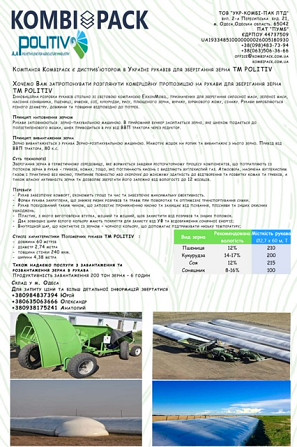 Наше підприємство являється постачальникомрукавів для зберігання зерна напрямувід європейського виробника.Характеристика рукавів європейського виробництва:Довжина – 60 м;Діаметр – 2,7 м;Товщина – 225 мікрон;Місткість 1 рукава довжиною 60 м – 200т (пшениці).Ціна – 32 000 грн/шт.Рукава підходять для з...