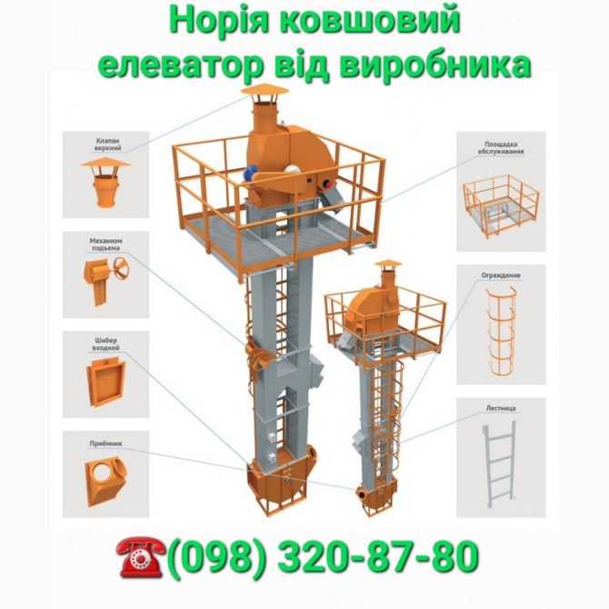 Науково-технічний опис продукту: Зернова ковшова норія є невід'ємною частиною елеваторного комплексу, що призначена для вертикального транспортування сипучих матеріалів. Цей тип елеватора має висоту від 4 до 60 метрів та продуктивність в діапазоні від 5 до 500 тонн на годину. Зернова норія вигото...