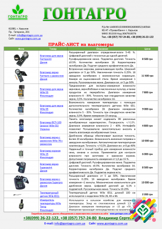 **Науково-технічний опис продукції:** Компанія "Гонтагро" є провідним постачальником високоякісного обладнання для агрономів та науково-дослідних лабораторій. Наш асортимент включає вологоміри Wile та Supertech, термощупи, пробоотбірники та інші технічні рішення, спрямовані на покращення якості ана...