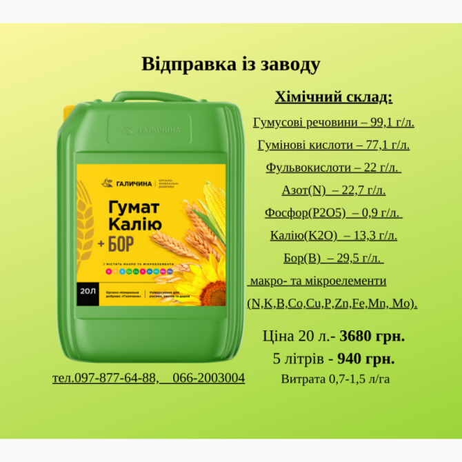 Добриво-стимулятор росту рослин "Гумат калію з азотом та фосфором" є ефективним засобом для підвищення врожайності сільськогосподарських культур. Ціна: 3680 гривень за 20-літрову каністру, або 9400 гривень за 5 літрів. Застосування: 1. Додавати до прополіскувального розчину для отримання сильних і ...