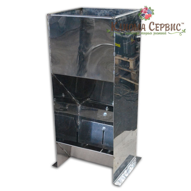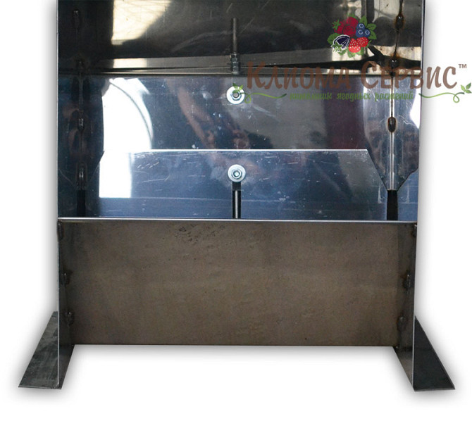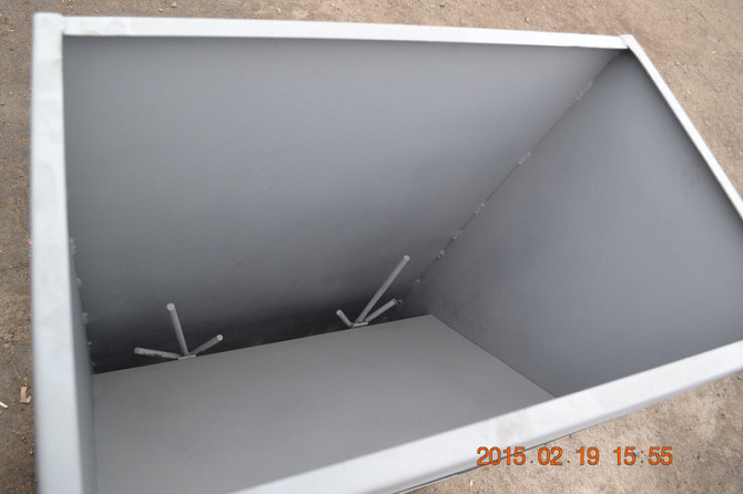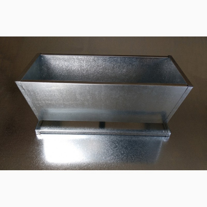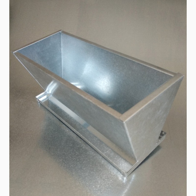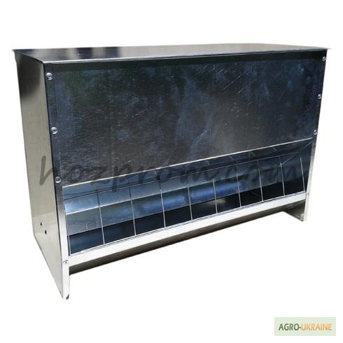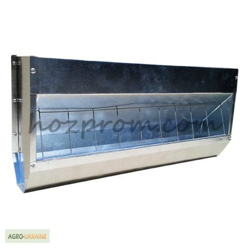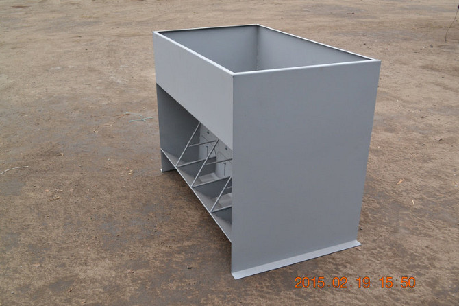 **Технічний опис кормушки-бункера для птахів** Кормушка-бункер є двосторонньою та призначена для кормлення кур, перепелів, качок та гусей. Виготовлена з оцинкованого листа товщиною 0,55 мм, що забезпечує стійкість до корозії та довгий термін служби. Характеристики: - Матеріал: оцинкований лист 0,5...