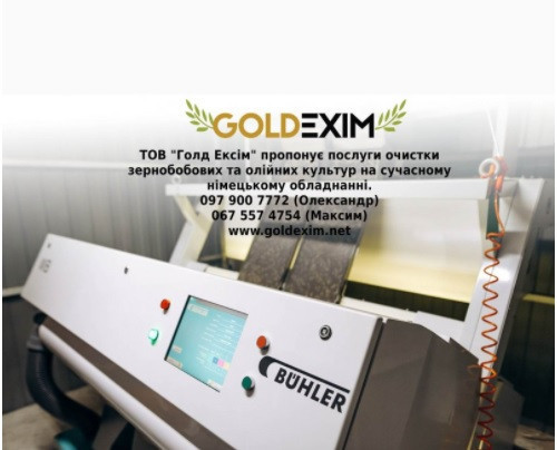 Компанія «Голд Ексім» Хмельницький пропонує послуги:- очищення сировини до чистоти 99,9% (попереднє очищення, аспірація, калібрування, металодетектор, оптична сортувальна машина Sortex від Buhler);- підготовка насіннєвого матеріалу із заданими кондиціями;- фасування (мішки, біг-біги);-Зберігання про...