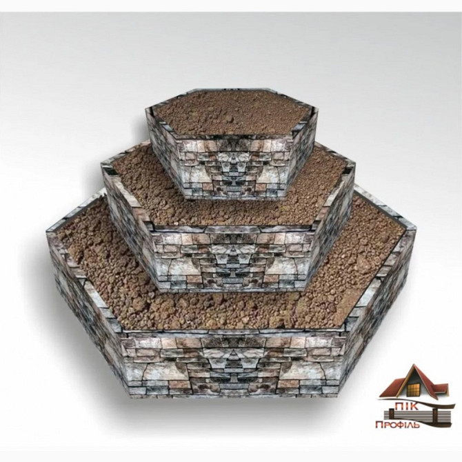 Унікальна технічна композиція східчастих клумб у формі Альпійських гір є не лише естетично привабливою, але й функціональною. Ця дизайнерська концепція дозволяє створити індивідуальний ландшафтний дизайн ділянки, який відображає стиль та смак власника. Клумби виготовляються у формі трикутників, чот...
