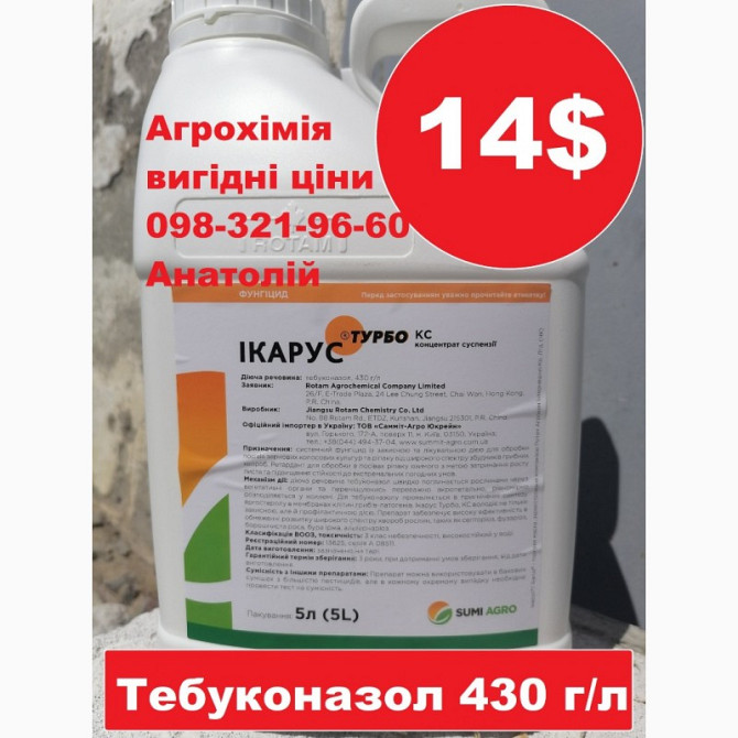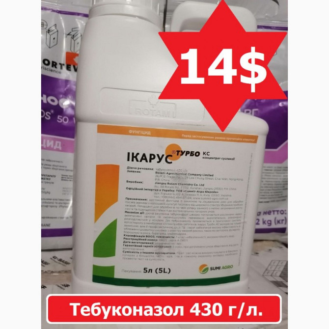 Придбайте фунгіцид Ікарус Турбо за вигідною ціною 15$ за літр. Діюча речовина - тебуконазол у концентрації 430 г/л. Фунгіцид Ікарус Турбо є системним фунгіцидом, який діє шляхом порушення біосинтезу ергостеролу - речовини, необхідної для формування клітинних мембран патогену. Препарат швидко абсорбу...