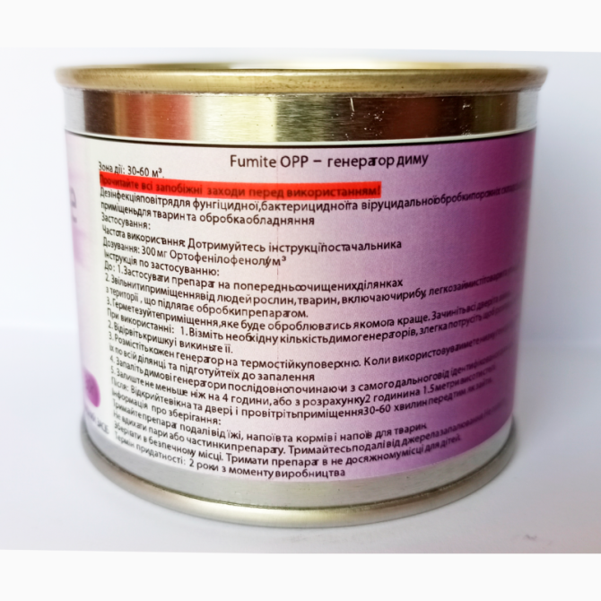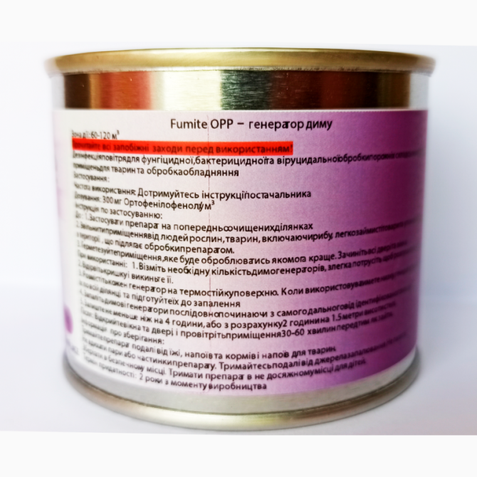 2-фенілфенол є універсальним дезінфікуючим засобом для поверхонь, який використовується в домашніх, медичних, сільськогосподарських, комерційних та промислових приміщеннях, зокрема на підприємствах харчової промисловості. Fumite OPP - це сухий дезінфікуючий дим, який ефективно бореться з бактеріями,...