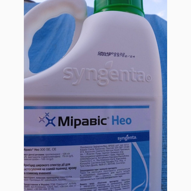 Фунгіцид Міравіс Нео є унікальним SDHI-фунгіцидом з найширшим спектром дії для захисту від хвороб пшениці та ячменю. Вміст діючої речовини: пропіконазол - 125 г/л, азоксистробін - 100 г/л, адепідин - 75 г/л. Препаративна форма: суспензійна емульсія. Хімічна група: триазоли, стробілурини. Діюча група...