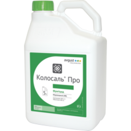 Фунгіцид **Колосаль® Про** - Колосальна Протидія хворобам! Двокомпонентний системний фунгіцид з тривалим періодом захисту зернових культур, сої, ріпаку, буряків цукрових та винограду від комплексу хвороб. Діюча речовина: пропіконазол 300 г/л, тебуконазол 200 г/л. Препаративна форма: мікроемульсія. К...