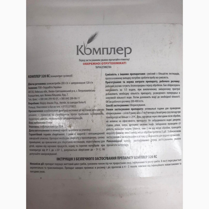 Пропозиція: Комплексний фунгіцид «Комплер 320 к.с.» для захисту соняшнику, сої, ярих та озимих зернових від хвороб листя та колосу. Діючі речовини: Азоксистробін - 200 г/л, Ципроконазол - 120 г/л. Препаративна форма: Концентрат суспензії (к.с.). Хімічна група: Стробілурини, Триазоли. Клас токсич...