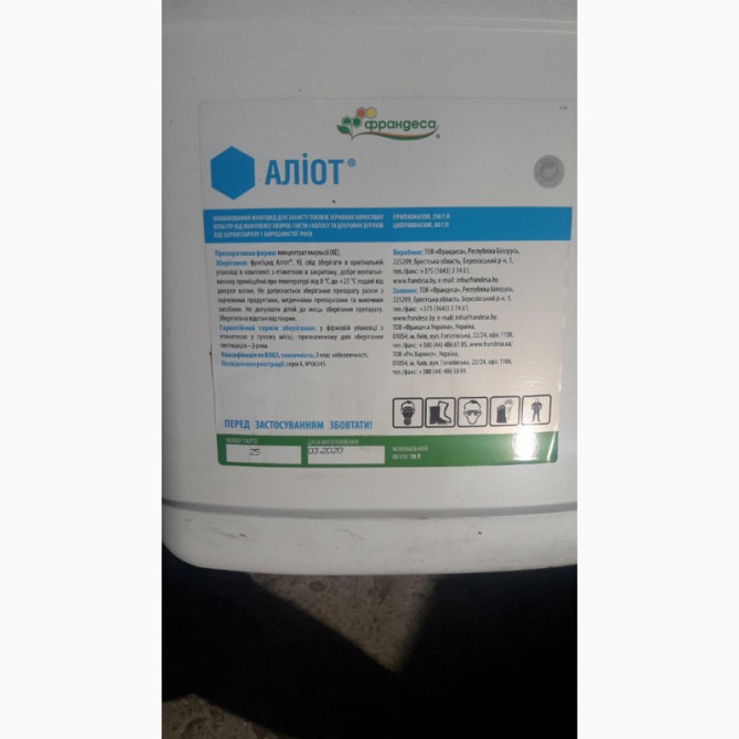 Аліот - це комбінований фунгіцид, який використовується для захисту зернових і колосових культур, а також для цукрових буряків. Діючі речовини: пропіконазол, 250 г/л + ципроконазол, 80 г/л. Хімічна група: Триазоли. Препаративна форма: Концентрат емульсії. Клас токсичності: Класифікація ВООЗ: 3. Норм...