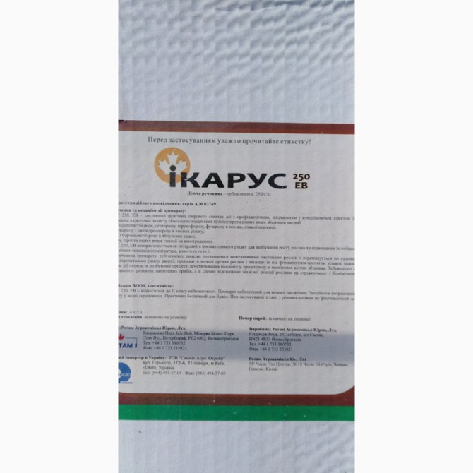 Ікарус 250 - фунгіцид та ретардант для посівів ріпаку, є надійним протигрибковим засобом для полів та садів на різних видів культур. Цей хімічний препарат ефективний проти широкого спектру грибкових захворювань. Діюча речовина: Тебуконазол Препаративна форма: водна емульсія Хімічний клас: триазини...