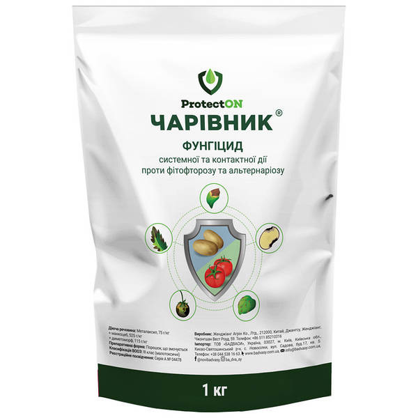 Чарівник - трикомпонентний фунгіцид системної і контактної дії для захисту і контролю небезпечних хвороб. Вміст діючої речовини: металаксил 75 г/кг + манкоцеб 525 г/кг + диметоморф 115 г/кг. Форма препарату: порошок, що змочується. Характер дії пестициду: вибірковий. Хімічний склад: неорганічні. Ти...
