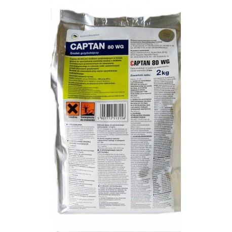 Captan 80 WG (Каптан) - контактний фунгіцид широкого спектру дії. **Препаративна форма:** водорозчинні гранули. **Діюча речовина:** каптан (800 г/кг). **Переваги препарату Каптан:** - Профілактична дія проти захворювань (1,9 кг/га). - Лікувальна дія триває протягом 36 годин з моменту інфікування ...