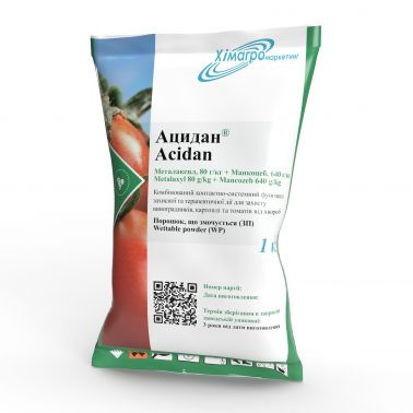 **АЦИДАН** Контактно-системний фунгіцид профілактичної та терапевтичної дії для захисту винограду, картоплі, помідорів, огірків, цибулі та інших сільськогосподарських культур від збудників несправжньої борошнистої роси (мільдью на винограді), фітофторозу, пероноспорозу, альтернаріозу та інших плям...