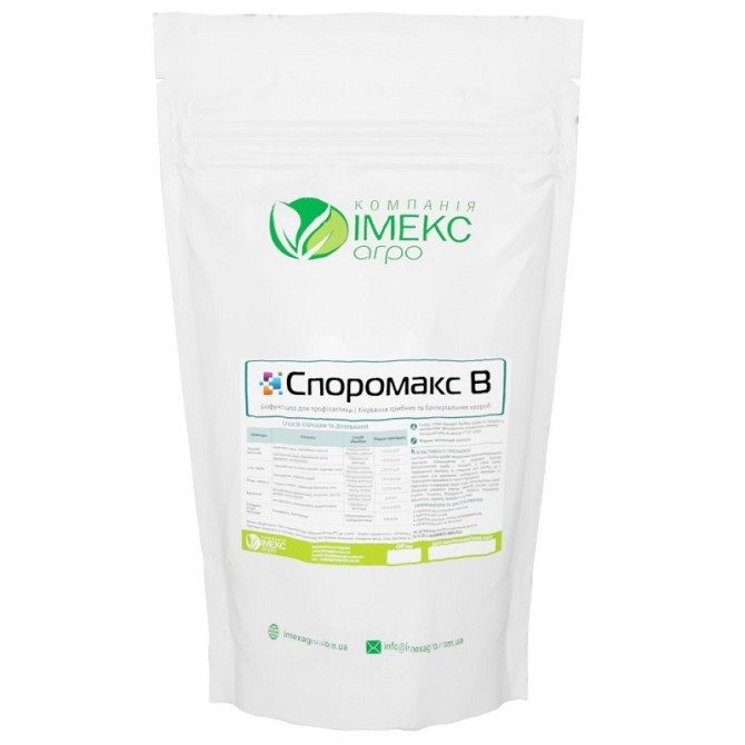**Біофунгіцид широкого спектру дії СпороМакс™ В** **Призначення та властивості:** СпороМакс™ В - біофунгіцид для профілактики та лікування грибних та бактеріальних хвороб в посівах різних культур, включаючи сільськогосподарські, плодово-ягідні, овочеві та декоративні. Діюча речовина - спори бактері...