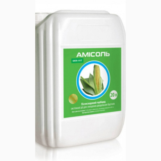 **Гербіцид Амісоль РК** Гербіцид Амісоль РК - це післясходовий гербіцид системної дії, призначений для знищення дводольних видів бур'янів у посівах зернових та колосових культур, а також кукурудзи. - **Виробник:** Укравіт - **Тара:** каністра 20л, ціна вказана за 1л - **Діюча речовина:** 2,4-Д (ам...