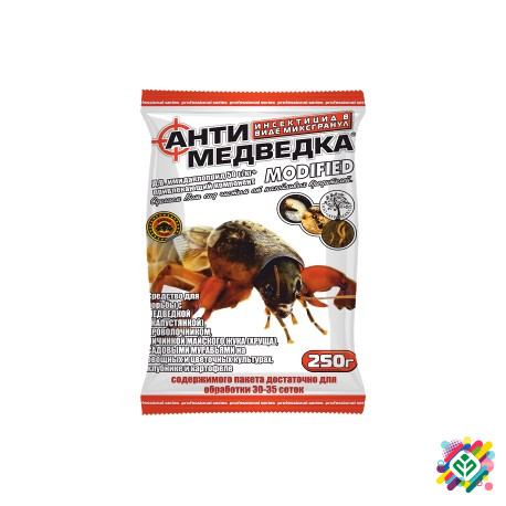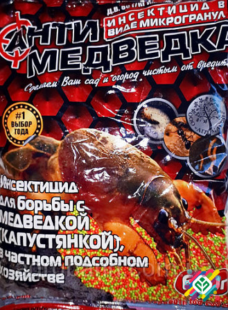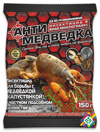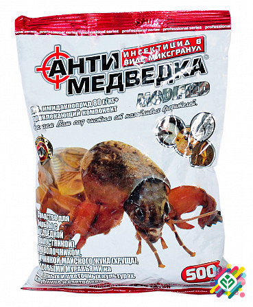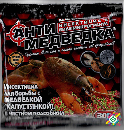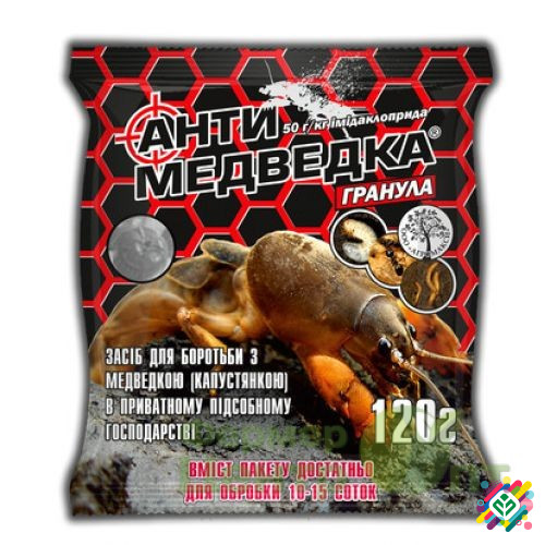 Засіб для боротьби з медведкою в особистому господарстві. Знищує медведку (капустянку), проволочника, личинку травневого жука, чорних мурах. Спосіб застосування: під час посадки викопати лунки на відстані 5-10 см від культурної рослини і помістити в них препарат на глибину 2-5 см у розрахунку 20 г н...