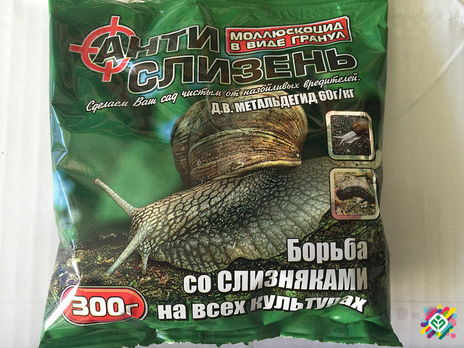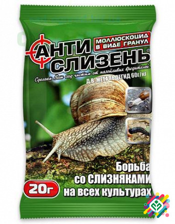 Мінімальна сума замовлення - 350 грн. Упаковка: 20 г, 60 г, 300 г, 1 кг. Інсектицид "Антислизень" у формі гранул об'ємом 300 г - ефективний засіб для боротьби з слизняками на всіх видів культур, а також у підвальних приміщеннях і погребах. Діюча речовина: металдегід. Металдегід має кишкову та конта...