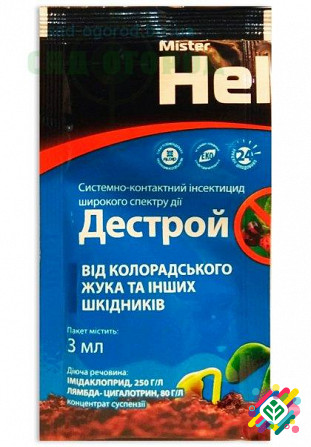 Мінімальна сума замовлення 300 грн. Дестрой - системно-контактний інсектицид широкого спектра дії, що забезпечує чисті кущі картоплі та інших рослин завдяки двом діючим речовинам. Препарат ефективно знищує колорадського жука та інших шкідників. Діючі речовини: імідаклоприд 250 г/л, лямбда-цигалотр...